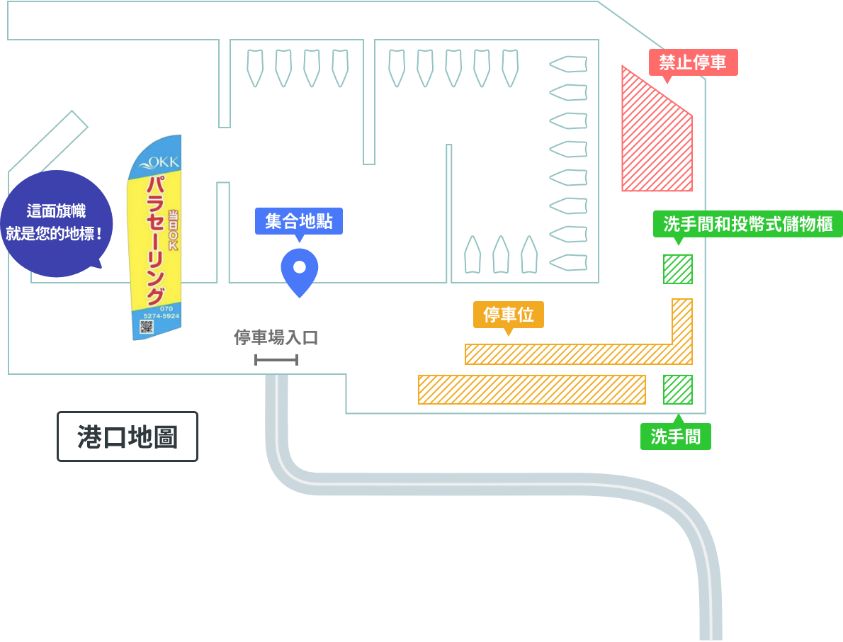 停車費為每天500日圓。請提前準備好硬幣。黃色區域設有停車位。綠色區域設有洗手間和投幣式儲物櫃。請換好衣服後前往藍色標記處。請尋找寫有“OKK パラセーリング”的旗幟。